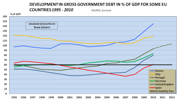 For Italia var den offentlige inntektsstrømmen rundt 46 % av BNP og forholdet mellom gjeld og BNP var rundt 120 % i 2010.