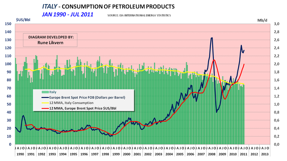 Italia synes å ha hatt en topp i oljeforbruket i 1998. Med prisveksten på olje fra rundt 2003 falt forbruket jevnt. Den fortsatte prisveksten på olje akselererte nedgangen i oljeforbruket og det ventes nå å falle ytterligere fra virkningene av de ulike innstramningstiltakene.