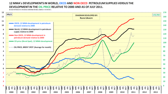Den globale oljeforsyningen var så flat mot 2008 og diagrammet viser at prisvekst var virkemiddelet som omfordelte olje fra OECD til landene utenfor OECD.