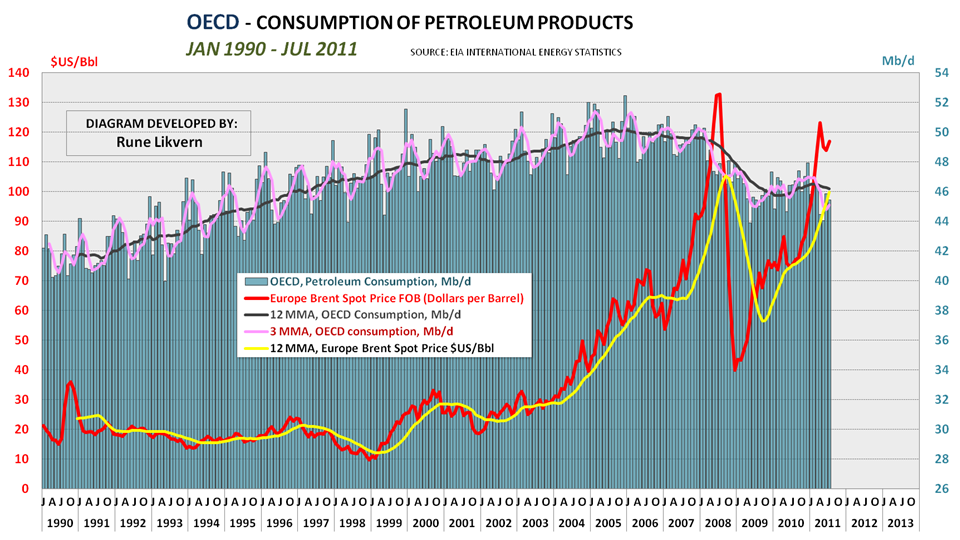 For OECD landene var det en jevn økning i forbruket av olje (all energi i væskeform) frem til rundt 2005 da kombinasjonen av voksende oljepris og subprime snudde forbrukstrenden. Den voksende oljeprisen og Lehman konkursen sendte både OECD forbruket og oljeprisen merkbart lavere høsten 2008. Det kan synes som at virkningene av de ulike økonomiske tiltakspakkene snudde denne trenden. I den siste tiden har oljeforbruket innenfor OECD igjen vist en synkende tendens.