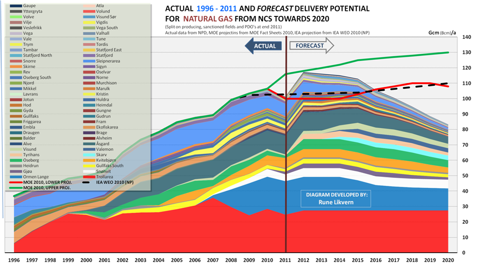 I følge OD sine data hadde Sleipnerområdet et R/P på rundt 2,7 ved årsslutt 2011, dette gir forventninger om at utvinningen fra Sleipner vil falle bratt i tiden fremover. Senere vil Åsgard området, Kvitebjørn osv se fallende utvinning. Kollsnes og Ormen Lange går for fullt i vinterhalvåret noe som i hovedsak overlater til øvrige felt (Others) å øke utvinningen i årene fremover.