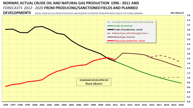 Diagrammet ovenfor viser at norsk gassutvinning krysset råoljeutvinningen i 2010 og at gassutvinningen vil ligge over råoljeutvinningen mot 2020.