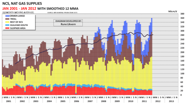 Diagrammet ovenfor illustrerer også de sesongmessige variasjonene i bestillingene fra kjøperne. Figuren viser at for de siste vintrene har to felt, Ormen lange og Troll, stått for rundt 50 % av de totale norske gassleveransene. For januar 2012 rapporterte OD om ”Rekordsalg av gass i januar”, noe som harmonerer med prognosen vist i figur 1.