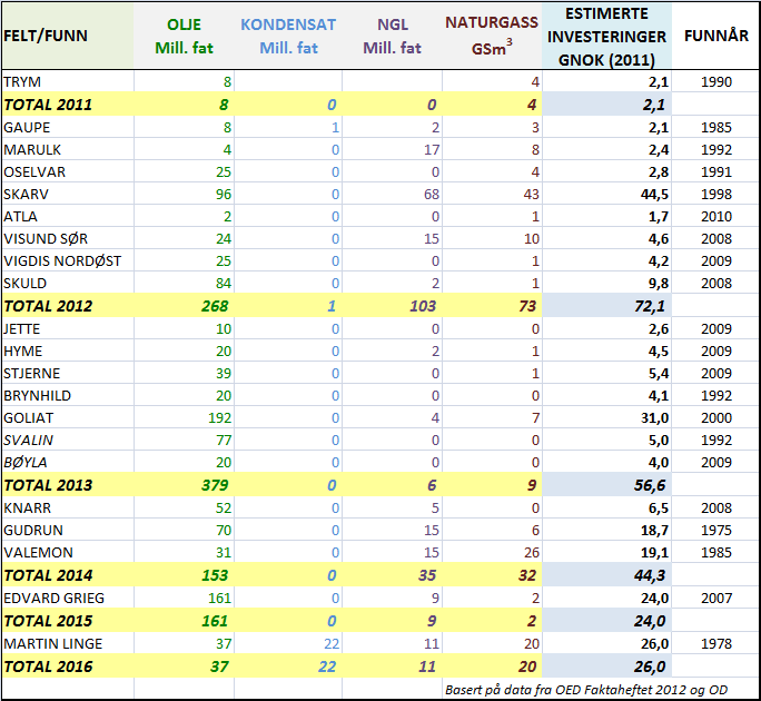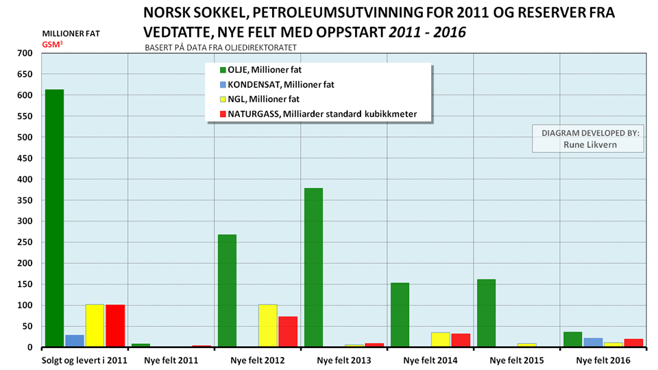 Norge solgte og leverte 613 millioner fat råolje i 2011. De nye feltene som nå ventes satt i utvinning fra 2011 til 2016 vil bringe i overkant av 1 000 millioner fat råolje i utvinning.