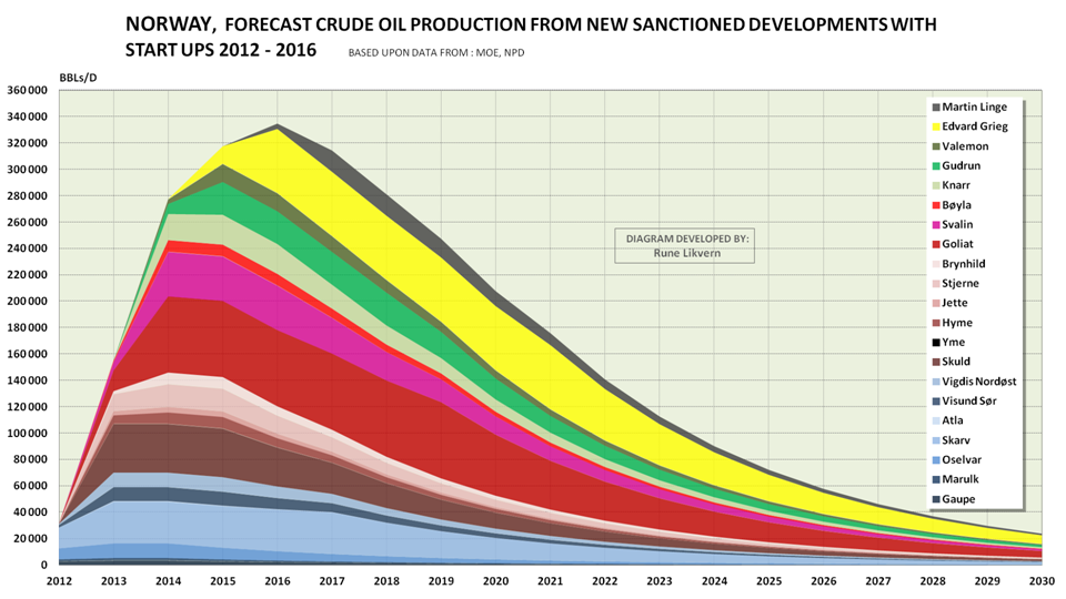 Prognosen beskriver nå noe som kan se ut som en hylle (shelf) for årene 2012 – 2014 og fra 2015 ventes effekten fra uttømming og fallrater igjen å bli dominerende.