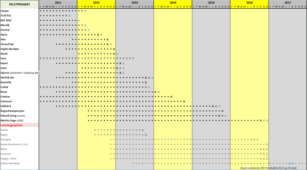 Oversikten ovenfor viser at det vil være høy aktivitet med nye utbygginger, mer enn 20 samtidig i 2012 fallende til 4 – 8 sent i 2015 (om hva som nå er utbygginger under planlegging som Aasta Hansteen, Johan Sverdrup, Draupne og Wintershall’s Maria (for å nevne noen) blir sanksjonerte).