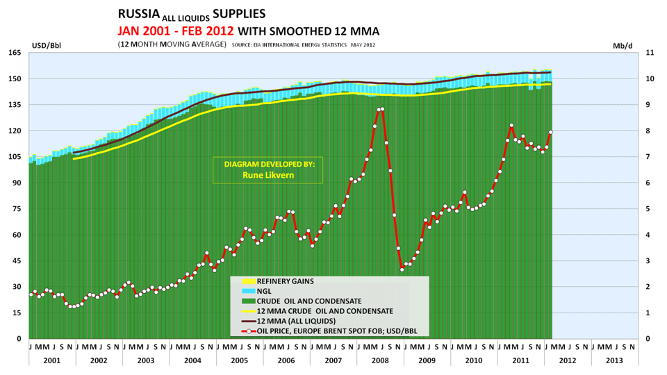 De siste årenes vekst i den russiske oljeforsyningen har blitt svekket de siste månedene. EIA spår i sin STEO for mai 2012 (STEO; Short Term Energy Outlook) en vekst i forsyningen fra Russland på rundt 0,1 Mb/d fra 2012 til 2013.