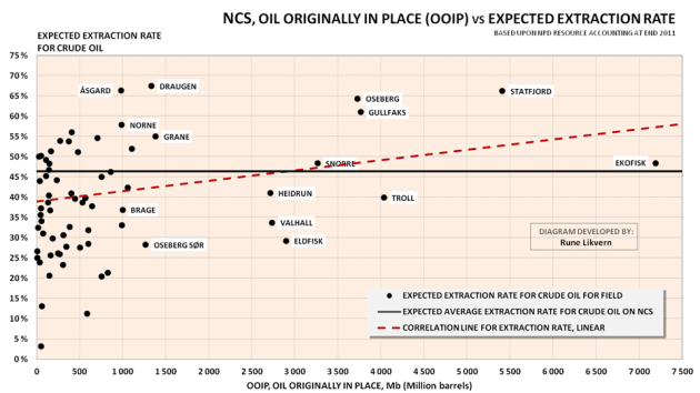 Den røde stiplete linjen viser korrelasjonen mellom opprinnelig tilstedeværende råolje og ventet utvinningsgrad.