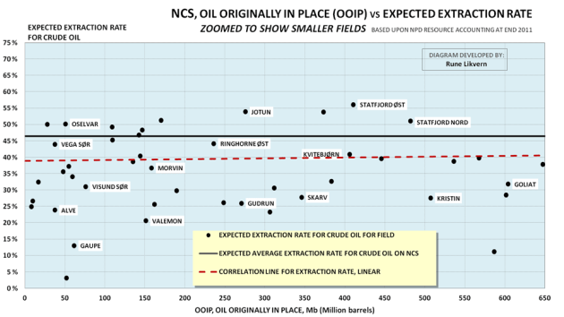 Figur 3 viser at generelt ventes store felt/funn å gi en høyere utvinningsgrad enn mindre. Dette er også observert for andre petroleumsbasseng.