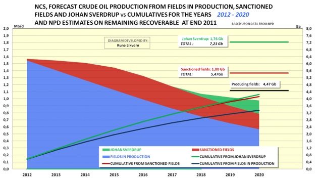 - Figur 6: I diagrammet ovenfor er prognosen fra figur 5 ”blåst opp” for perioden 2012 – 2020. I diagrammet er også vist (høyre akse) Oljedirektoratets estimat på gjenværende utvinnbart ved slutten av 2011 for felt i utvinning (4,47 Gb), estimat på totale tillegg fra felt vedtatt eller ventet vedtatt satt i utvinning (1,00 Gb) og til sist Oljedirektoratets nåværende estimat på utvinnbart fra Johan Sverdrup (1,76 Gb). Det blå arealet viser prognosen for utvinning fra felt i utvinning, det mørke rød bidraget fra felt vedtatt satt i utvinning og det grønne arealet bidraget fra Johan Sverdrup ved oppstart i 2018, disse avleses mot den venstre aksen.