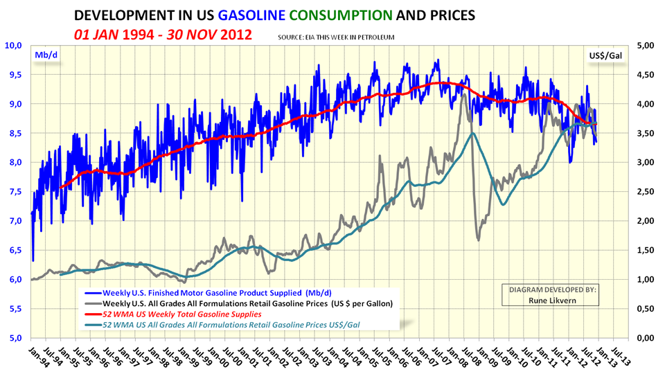 Bensinforbruket i USA vokste inntil boligboblen sprakk. Det følgende året var det et moderat fall i bensinforbruket som så stabiliserte seg i et par år og det siste året har det igjen vært et merkbart fall. Fallet i bensinforbruket nå sammenfaller med en vedvarende høy bensinpris.