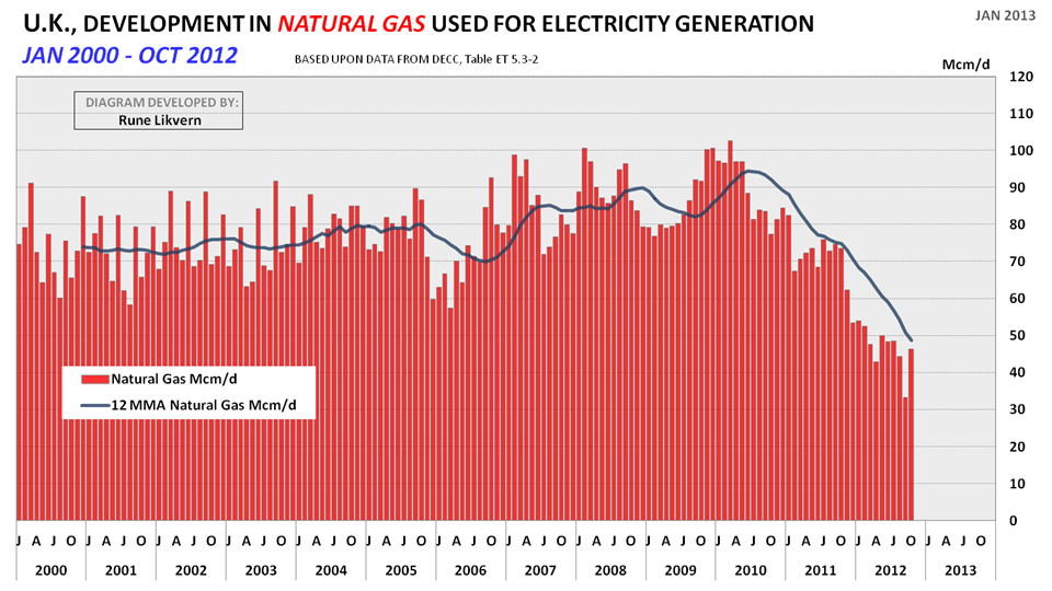 Figur 2 viser hvordan forbruket av naturgass i Storbritannia falt sterkt fra slutten av 2010 da prisen beveget seg over 50 p/therm ($8/Mcf; [Mcf = 1 000 kubikkfot = 28,3 Sm3] og hadde (på årlig basis) per oktober 2012 falt med 20 % (eller rundt 50 MSm3/d; millioner kubikkmeter per dag) ettersom prisen fortsatte oppover, og nå er prisen rundt 65 p/therm (vel $10/Mcf). Prisen referert til er på handelsstedet National Balancing Point (NBP).