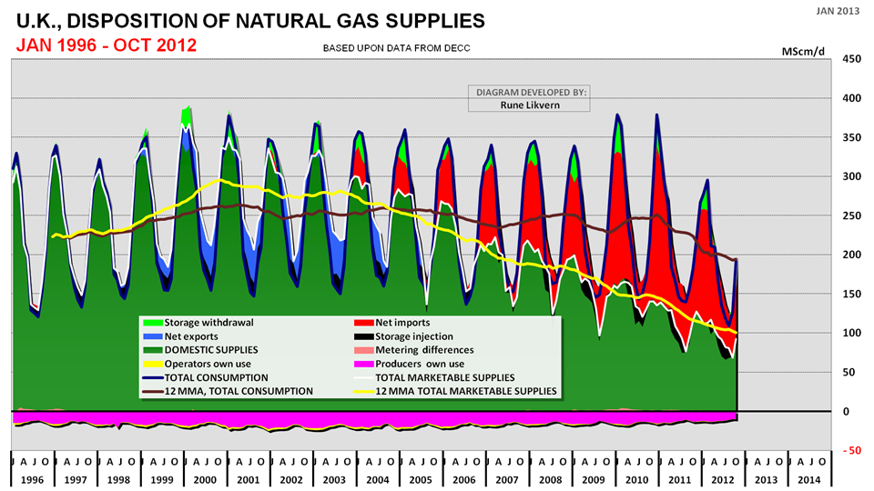 Den gule linjen viser utviklingen i utvinningen av årlig markedsført naturgass i Storbritannia og den mørke røde linjen viser den årlige forbruksutviklingen. Det voksende gapet mellom forbruk og innenlandsk produksjon blir dekt gjennom import.