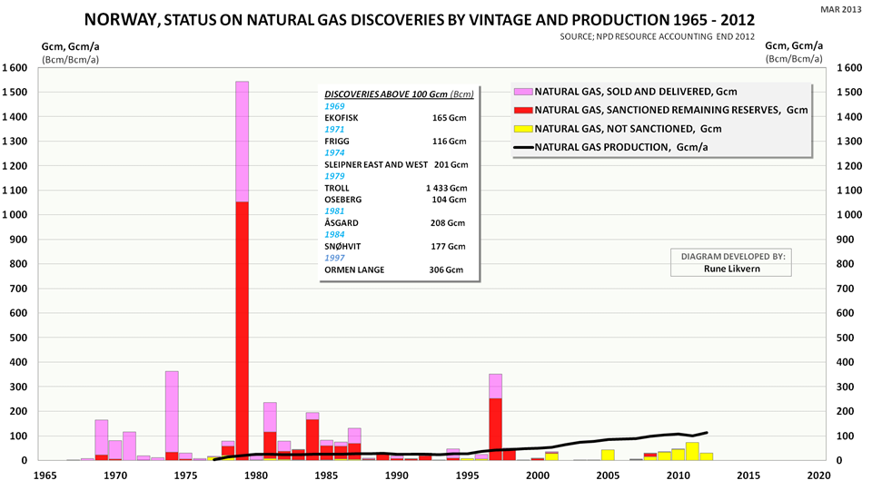 Norske naturgassleveranser kommer i hovedsak fra reserver i funn fra 70 og 80’årene og Ormen Lange som ble påvist i 1997.