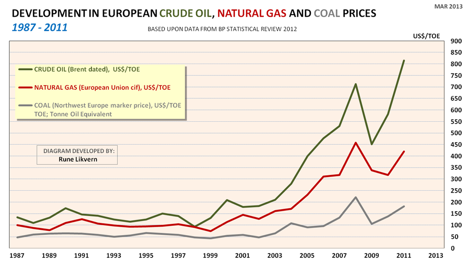 Veksten i oljeprisen dro med seg naturgass- og kullprisene og fra 2005 vokste prisgapet mellom kull og naturgass i Europa til over $100/TOE og har siden hatt en voksende trend.