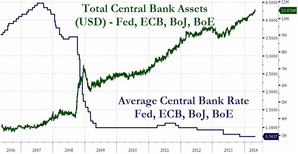 Figure 2: The chart above has been lifted from a recent article at ZeroHedge (linked above). The green line in the chart shows total central banks’ assets [outer right axis] in US$ Trillion. The blue line [inner right axis] shows developments in the interest rate, %.