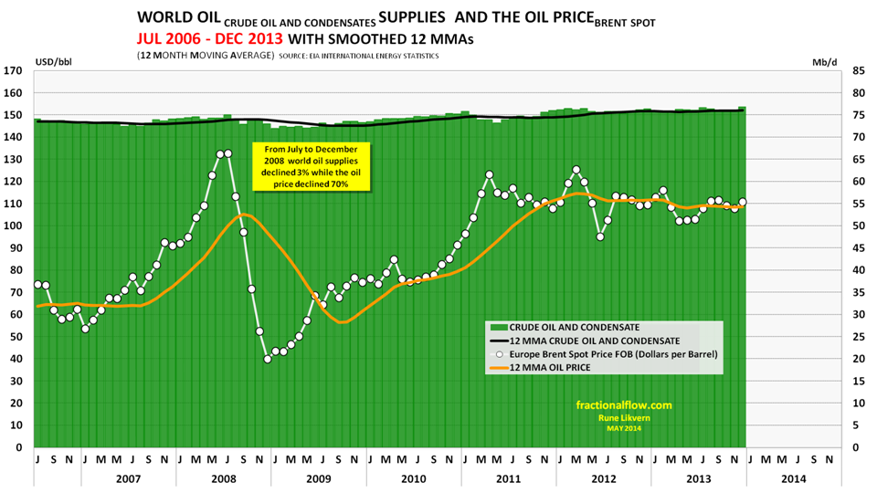 As far as supplies acts as a proxy for consumption/demand the decline in demand during a few months in 2008 was 3%, while the oil price collapsed by 70%. The steep decline in the oil price versus the minor decline in demand suggests the workings of other forces. These forces may have their origins in frozen liquidity pipelines in money markets and shadow conduits.