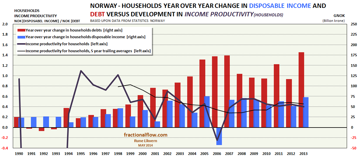 ![Figure 3: Chart above shows Year over Year (YoY) change in Norwegian nominal GDP (inclusive petroleum related activities) [blue columns, rh scale] and YoY change in nominal total debts (households, municipalities and non-Financials (inclusive oil companies and companies delivering products/services to the petroleum industry) [red columns, rh scale]. The thick black line shows the Marginal Productivity of Debt (MDP) by vintage and the thin gray line the 5 year trailing average plotted against the lh scale. In 2013 1.00 NOK of additional debt added less than 0.40 NOK to the GDP.](https://runelikvern.com/wp-content/uploads/2020/05/4a77f-figure-3-norway-yoy-changes-in-gdp-and-debt.png?w=630&h=272)