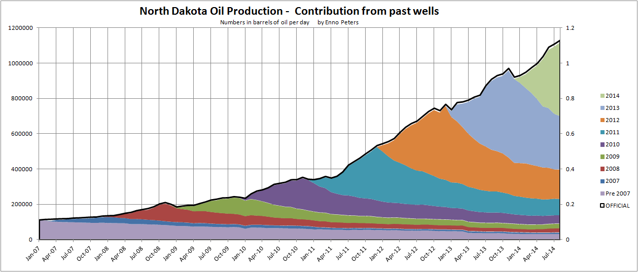 If no wells were added the total LTO extraction from Bakken would decline somewhere between 30 –  40% after 12 months. On August 2014 LTO extraction was approaching 1.1 Mb/d, which would result in a decline of 0.3 – 0.4 Mb/d after 12 months if no more wells were added.
