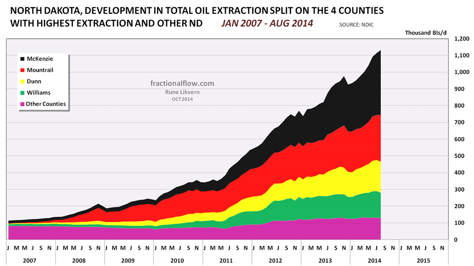 Figure 02: The chart above with the stacked areas shows developments in all oil extraction in North Dakota as of January 2007 and of August 2014 split on the 4 counties with the highest extraction and the rest of North Dakota. Growth in oil extraction in North Dakota is now primarily from McKenzie and Mountrail counties.