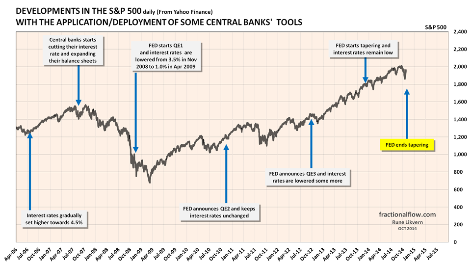 The chart suggests causation between Fed policies and movements in the stock index.