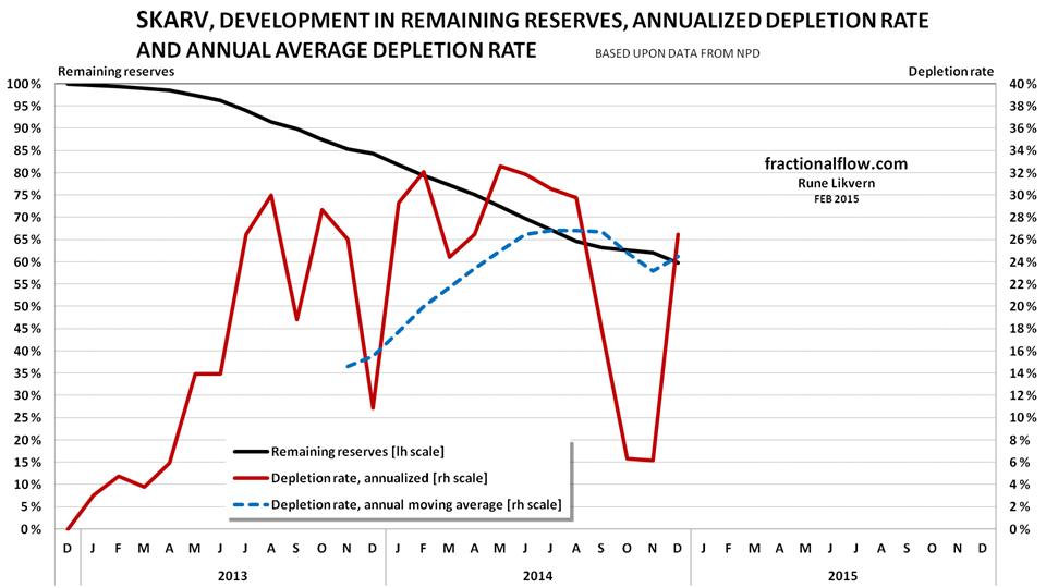 The past high crude oil depletion rate for Skarv suggest now a steep decline for the near future extraction.