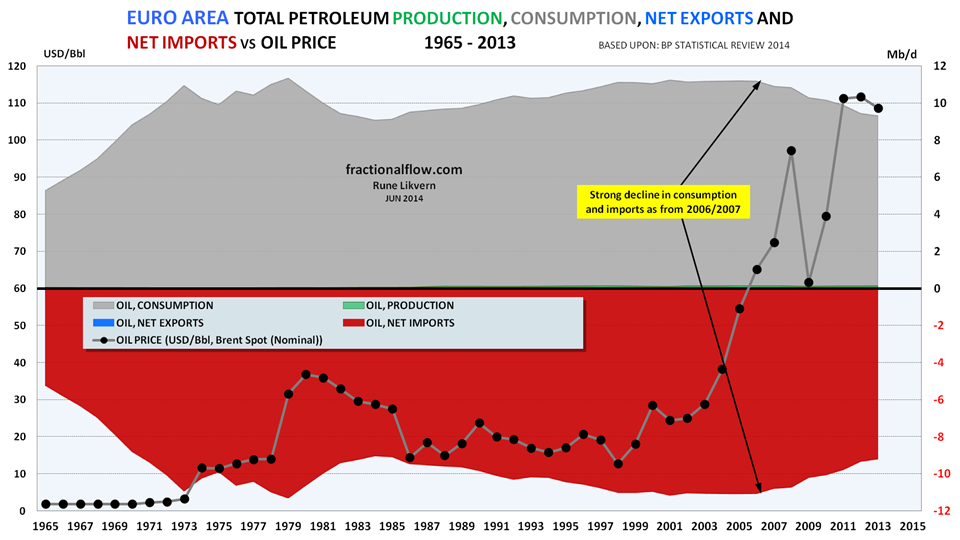 The decline in the Euro area’s total petroleum consumption started in 2006/2007 as the oil price grew and while the Euro area had strong growth in total debt. The decline in petroleum consumption accelerated while the oil price remained high and debt growth slowed and transitioned into a deleveraging.