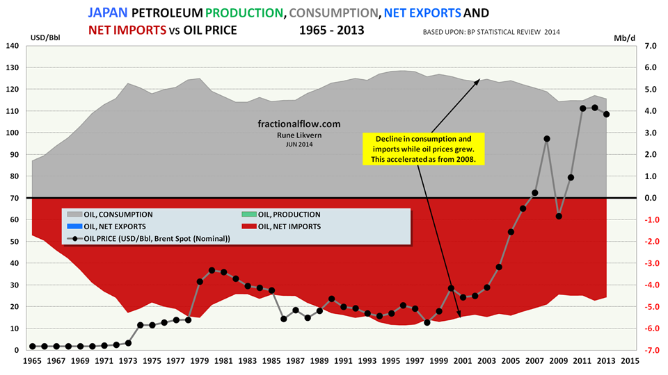 Japan had a decline in oil imports and consumption while the oil prices grew and the private sector deleveraged. The Fukushima accident temporarily led to an increase of the Japanese oil imports.