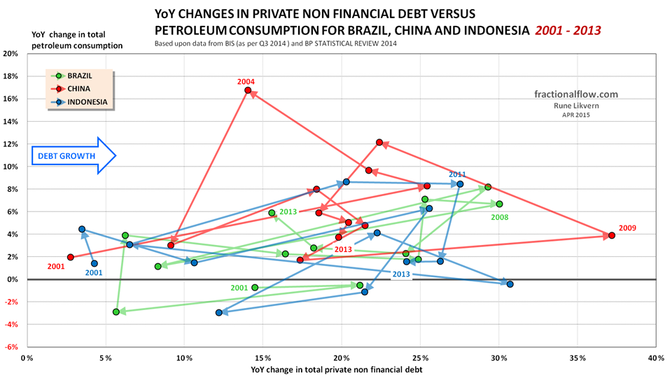 ![Figure 13: The chart above shows the YoY changes in total private non financial debt [horizontal axis] plotted versus the YoY changes in total petroleum consumption [vertical axis] for Brazil [green dots connected by a green line], China [red dots connected by a red line] and Indonesia [blue dots connected by a blue line] from 2001 to 2013. The lines have arrows to show the direction and some years indicated to improve identification of movements.](https://runelikvern.com/wp-content/uploads/2020/05/e7a66-figure-13-china-brazil-and-indonesia-changes-in-pet-consumption-versus-debt.png?w=630&h=354)
