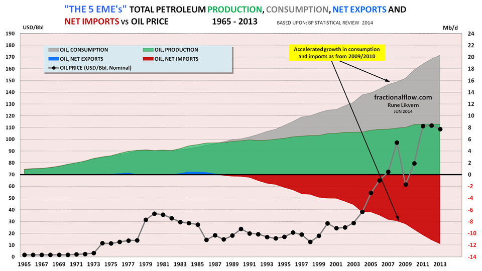 All the 5 EME’s are net importers of oil. Between 2008 and 2013 these 5 EME’s grew their total petroleum consumption with close to 30% or about 4.5 Mb/d.