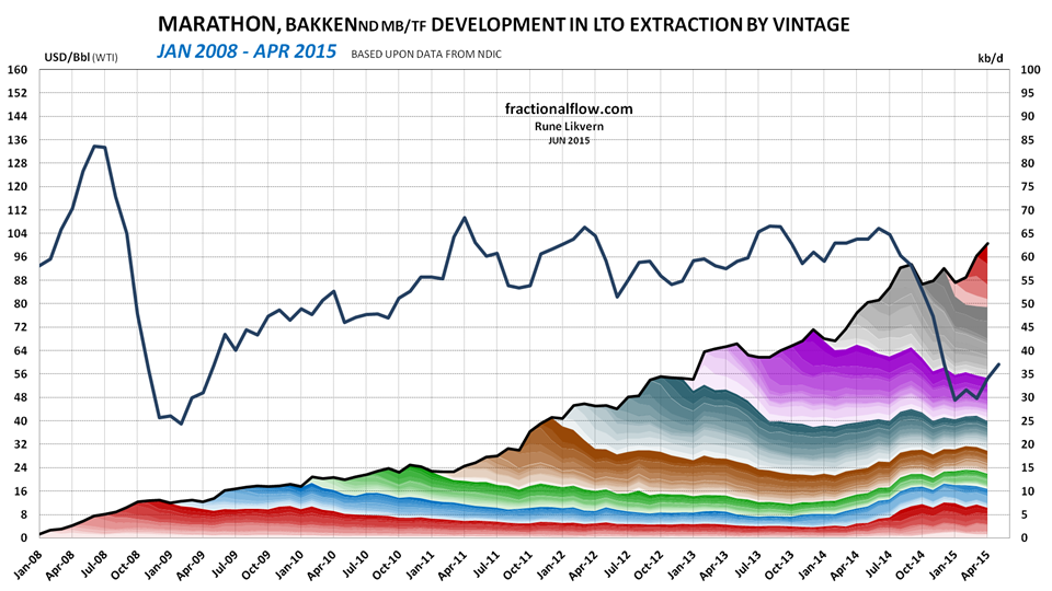 ![Figure 5: The chart above shows developments by vintage in LTO extraction for marathon in Bakken (ND) as of January 2008 and of April 2015 [right hand scale]. Development in the oil price (WTI) black line is shown versus the left hand scale. The chart does not include contributions from wells starting to flow prior to 2008 and the contributions from these wells normally diminishes as the wells ages.](https://runelikvern.com/wp-content/uploads/2020/05/2b72d-fig-5-marathon-bakken-lto-by-vintage-apr-15.png?w=630&h=354)