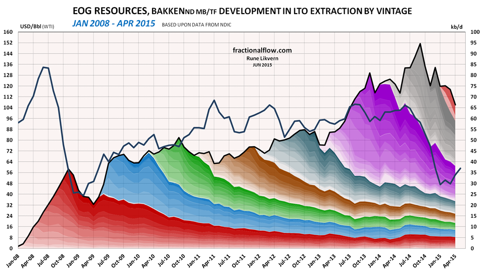 ![Figure 3: The chart above shows developments by vintage in LTO extraction of EOG Resources in Bakken (ND) as of January 2008 and of April 2015 [right hand scale]. Development in the oil price (WTI) black line is shown versus the left hand scale. The chart does not include contributions from wells starting to flow prior to 2008 and the contributions from these wells normally diminishes as the wells ages.](https://runelikvern.com/wp-content/uploads/2020/05/5668b-fig-3-eog-bakken-lto-by-vintage-apr-15.png?w=630&h=354)