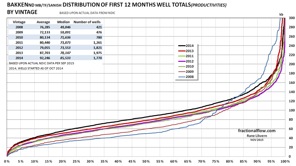 How to read the chart: The lines show the normal distribution for all studied wells started in 2008 – 2014, ref also the table in the upper left of the chart. 50 % of the 2014 wells have a total first 12 months flow flow of more than 86 kb while 43% were above the average of 92 kb. About 20% of the 2014 wells have a total first 12 months flow of 125 kb or more.