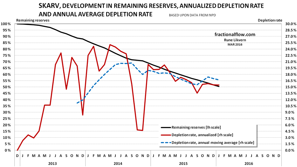 The past high crude oil depletion rate for Skarv now suggests a high decline for the near future extraction.