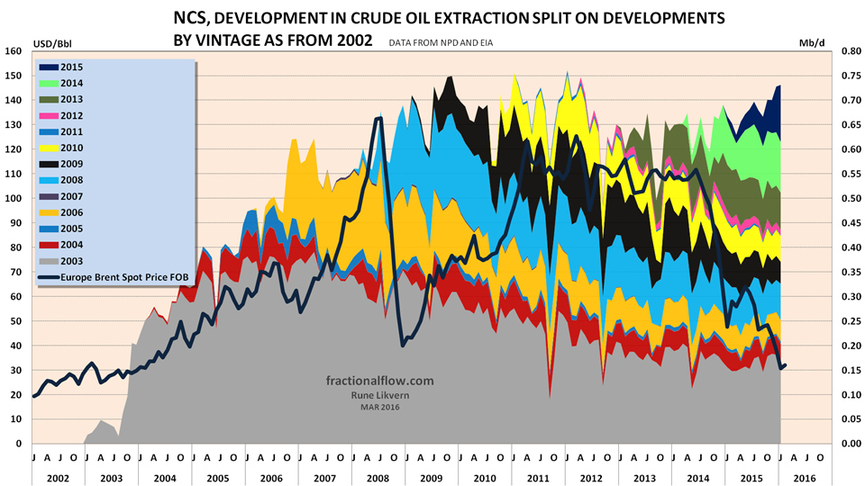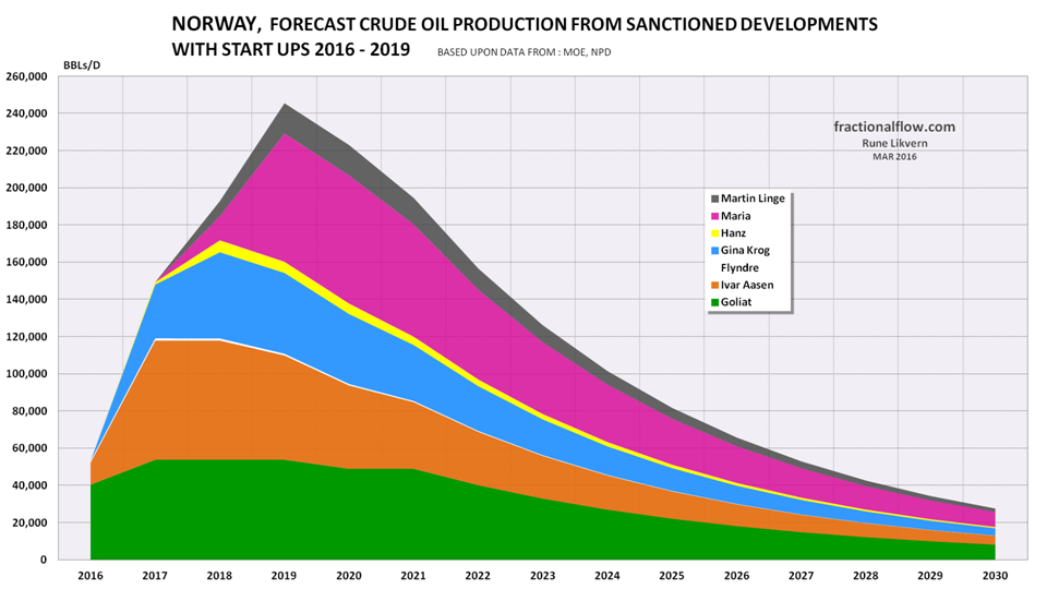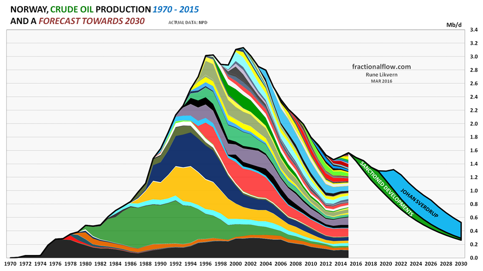 ![Figure 01: The chart shows the historical extraction (production) of crude oil (by discovery/field) for the Norwegian Continental Shelf (NCS) with data from the Norwegian Petroleum Directorate (NPD) for the years 1970 - 2015. The chart also includes my forecast for crude oil extraction from discoveries/fields towards 2030 based on reviews on individual fields, NPD’s estimates of remaining recoverable reserves, the development/forecast for the R/P ratio as of end 2015. Further, the chart shows a forecast for total crude oil extraction from sanctioned discoveries/fields (green area, refer also figure 02) and expected contribution from Johan Sverdrup (blue area) [at end 2015 estimated at 1.76 Gb; [Gb, Giga (Billion) barrels, refer also figure 06] and this development phase is now scheduled to start flowing in late 2019.](https://runelikvern.com/wp-content/uploads/2020/05/8f69a-fig-01-norway-actual-crude-oil-2015-and-forecast-to-2030.png?w=630&h=354)