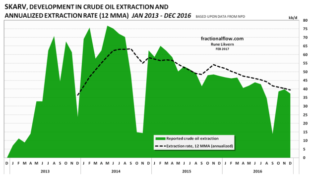 The past high crude oil depletion rate for Skarv and its R/P of 3,6 at end 2016 suggests now a continued high decline rate in the extraction.