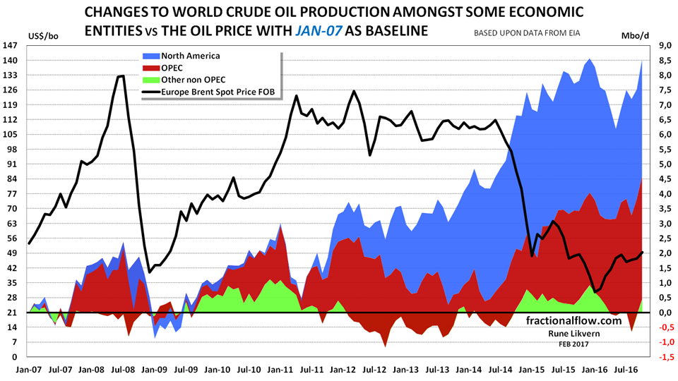 The chart also reveals another interesting fact, other non OPEC (light green area) had a negligible change to their oil extraction during the years the oil price remained high. The other non OPEC share of the global crude oil supplies has been in a steady decline since 2007 and was at about 37% (about 30 Mb/d) in 2016.