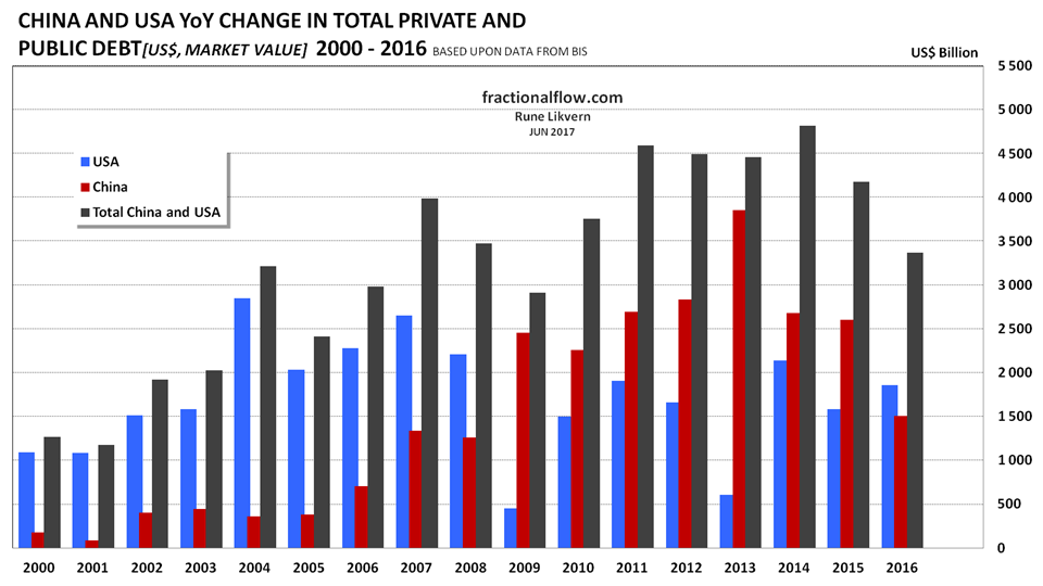 In 2015 China and the US added a total of $4,64 Trillion in (private and public) debt, which grew their GDP by $1,23 Trillion. In other words, it took about $3.79 of debt to grow GDP by $1.00.