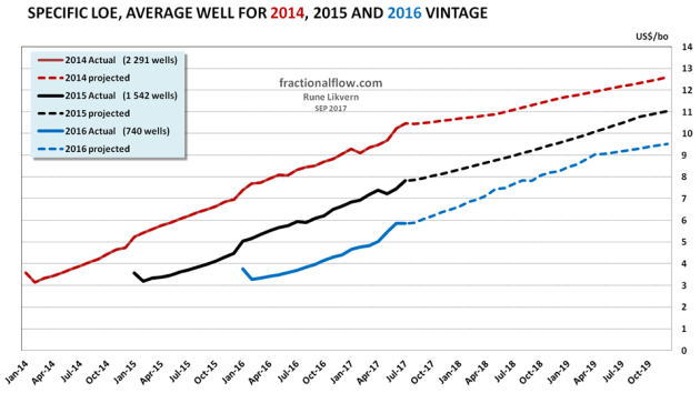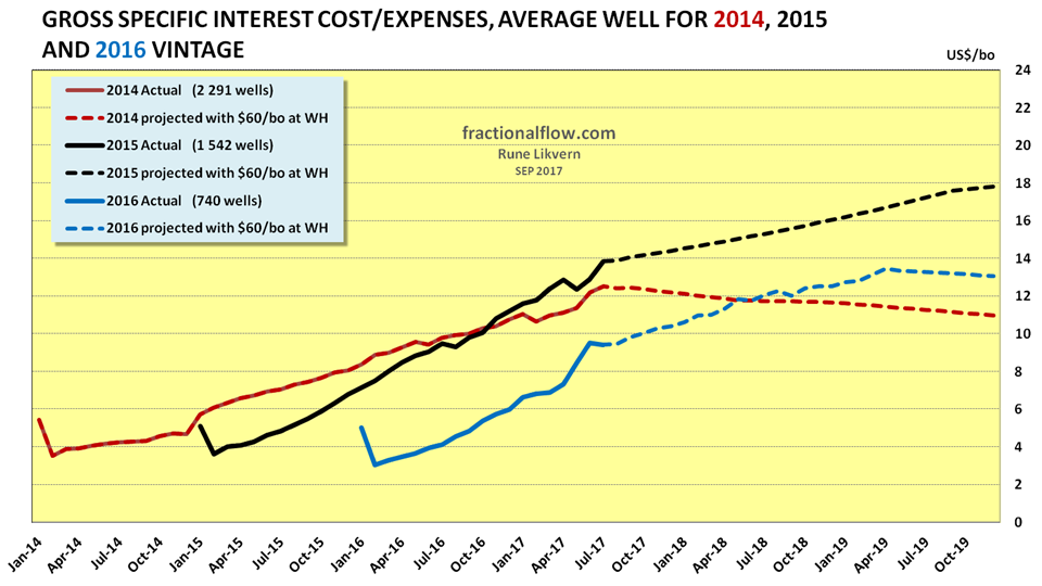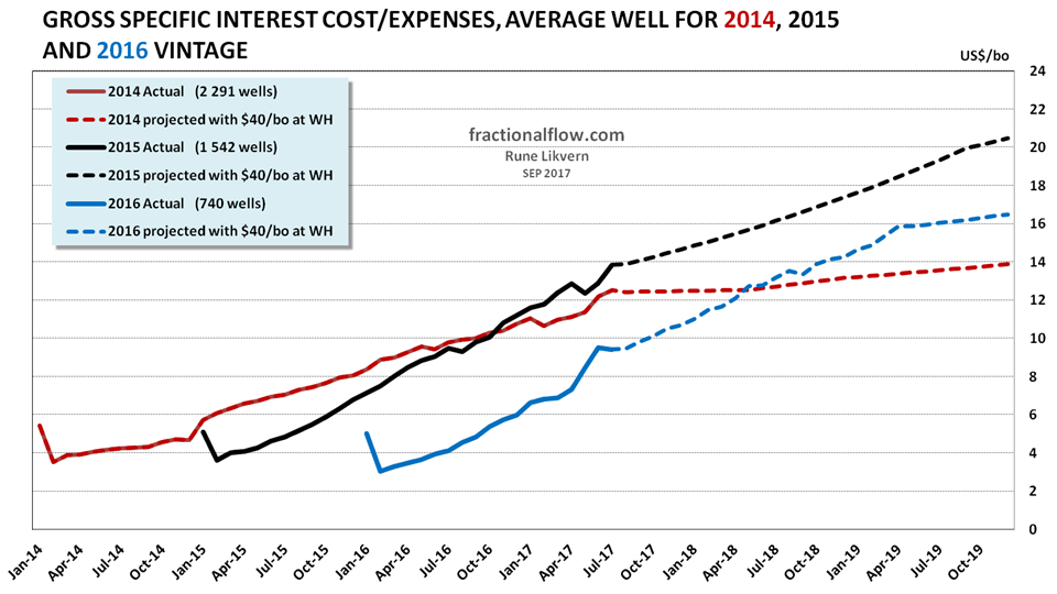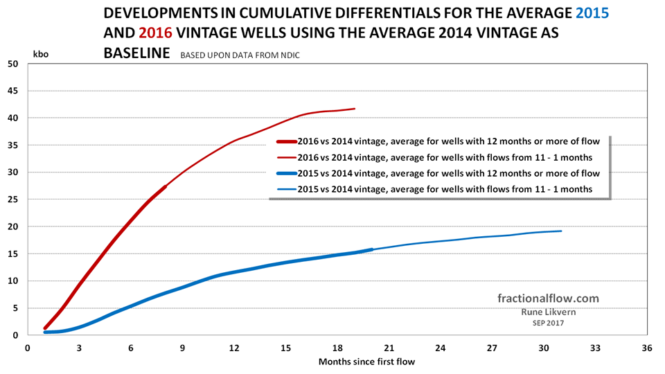The average 2017 vintage of wells has (so far) higher cumulatives and the higher oil price places these on a more favorable trajectory towards payout than the 2016 vintage, and the future oil price will become decisive for reaching payout and producing profits.