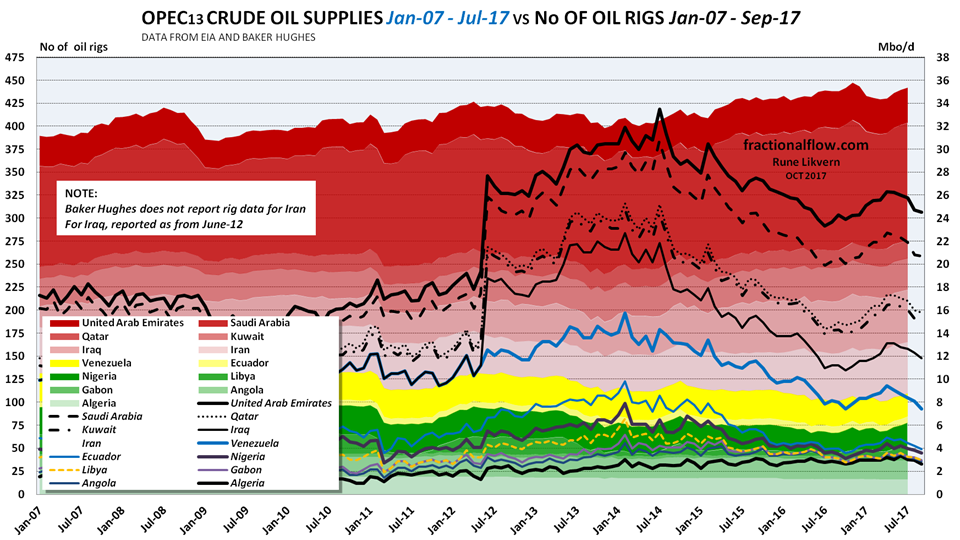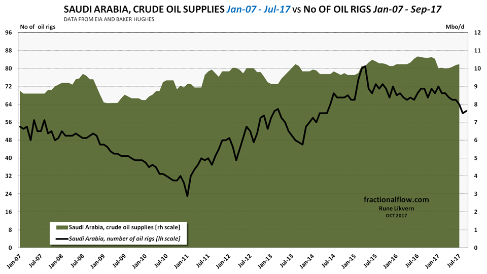 It appears, from looking at the number of oil rigs in Saudi Arabia, that it takes a high(er) number of rigs to sustain and grow oil production, and the number of oil rigs remained high as OPEC(13), led by Saudi Arabia increased its supplies with about 1 Mbo/d over a 2 year period post the oil price collapse.