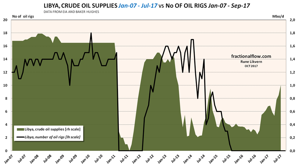 Libya was above 1 Mbo/d in July 2017 and is from several sources expected to reach 1,2 – 1,3 Mbo/d in the near future. It is now believed that it requires operation of several oil rigs and some time before Libya again will reach oil supply levels prior to the war.
