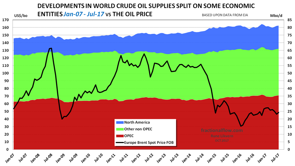 In this post I present developments in world crude oil (including condensates) supplies since January 2007 and per July 2017.