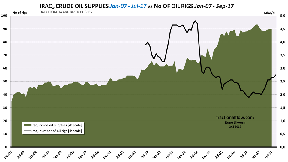 The chart also illustrates that it required a considerable amount of active oil rigs to grow Iraq’s oil supplies.