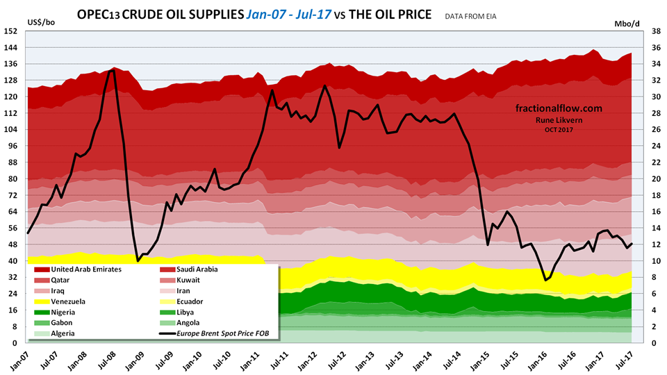 OPECs oil supplies in July 2017 was at 35,5 Mbo/d as Iran, Libya and Nigeria’s oil supplies totaled 0,9 Mbo/d more than in November 2016. That explains the recent uptick in OPEC oil supplies.