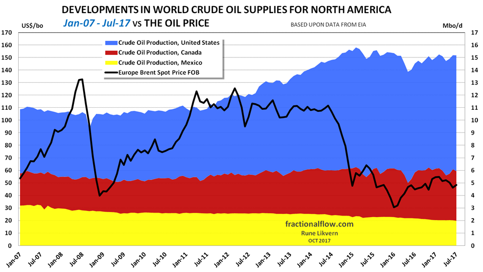 In comparison, North America increased its supplies (crude oil and condensates) from 14,7 Mbo/d to 15,1 Mbo/d during he same period, with a high of 15,8 Mbo/d in February 2015, refer also figure 03. In July 2017 North America was at 15,2 Mbo/d.