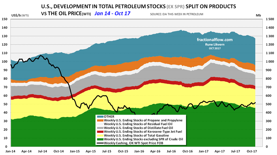 In the US petroleum stocks has continued to decline and are now about 60 Mb lower than in June 2017, ref also figure 15 above. For the US it should be expected the data may still be subject to the effects of the aftermaths of the hurricanes that caused outages of production in Texas and Gulf of Mexico and refineries in the Gulf area.