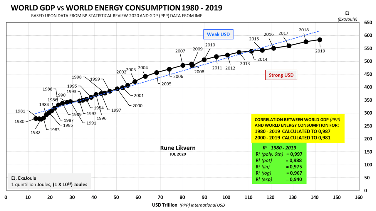- This article documents a perfect correlation between changes to the world GDP (PPP) with changes to world energy consumption.
