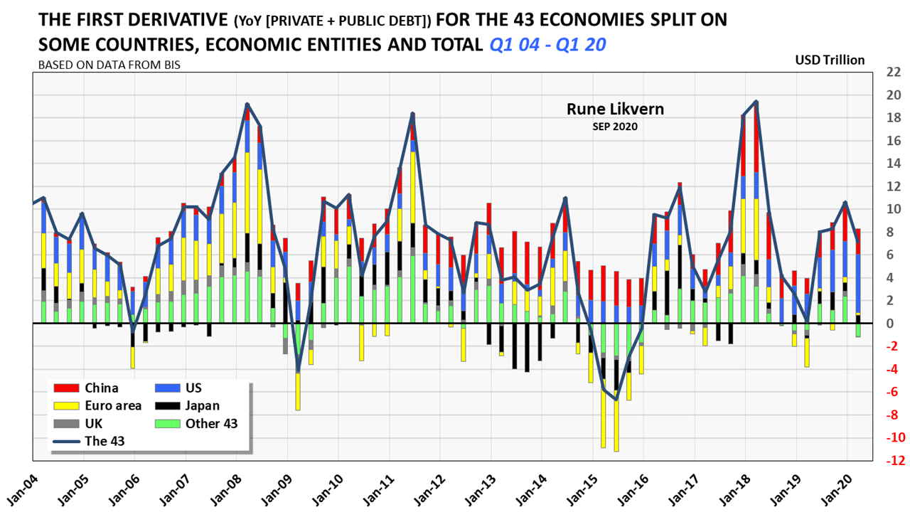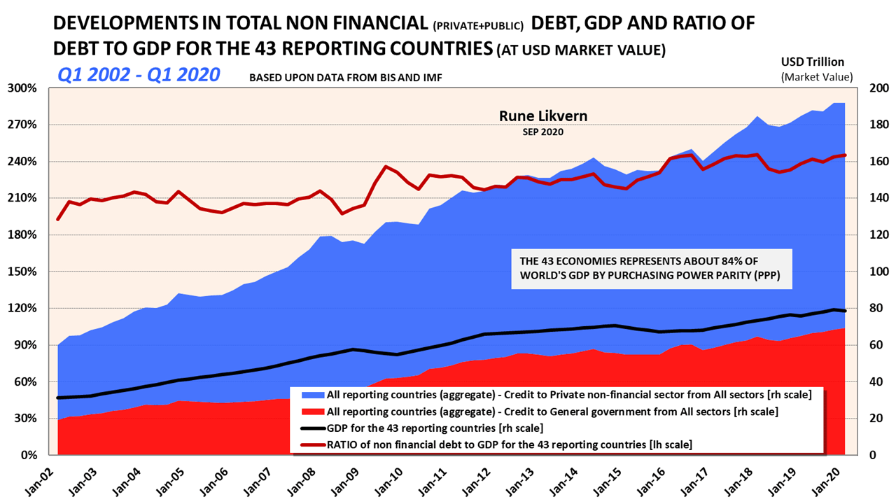 - The 43 economies took an average of USD 1,80 in non-financial credit/debt to create USD 1 in GDP from 2001 to 2019. In other words, credit/debt grew at a much faster pace than GDP, which will go on until it cannot.