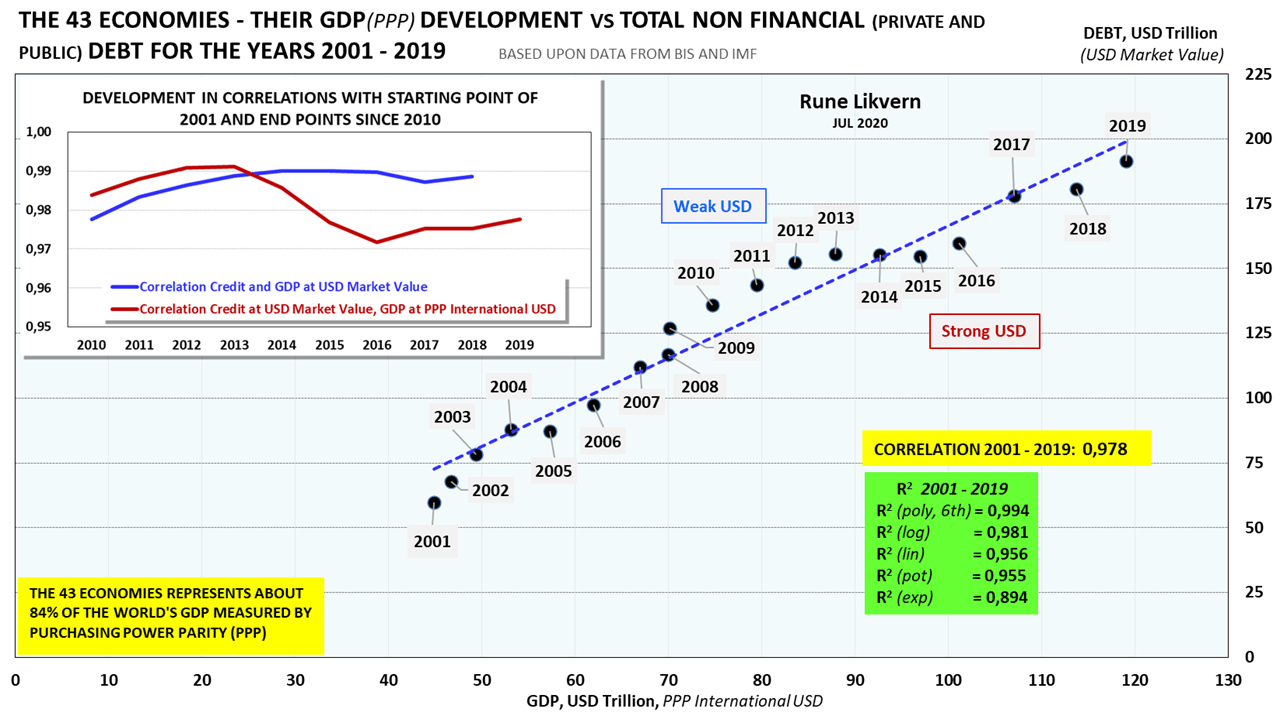 The embedded chart shows the developments in the correlations from 2010 to 2018/2019 using 2001 as a baseline. The blue line is based on credit and GDP at USD market value from 2010 to 2018 – the red line from 2010 to 2019 based on credit at USD market value and GDP at PPP.
