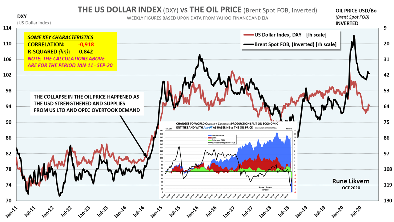 The rapidly growing DXY leading up to the oil price collapse in 2014 was a more dominant factor in the collapse of the oil price than the strong growth in U.S. Light Tight Oil (LTO) extraction followed by the increased supplies from OPEC, refer also figures 13, 15 and 16.